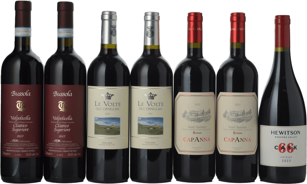 In this pack, you’ll find two bottles of 2021 Capanna Sant’Antimo Rosso Merlot Sangiovese, as fine as it is food-friendly. Next, two bottles of the “Super Tuscan” from Tenuta Dell’ornellaia, the Le Volte Toscana IGT, a 2022 release that garnered significant critical acclaim. Then, from one of Veneto’s most highly praised estates, two bottles of 2017 Tommaso Bussola TB Valpolicella Classico Superiore.