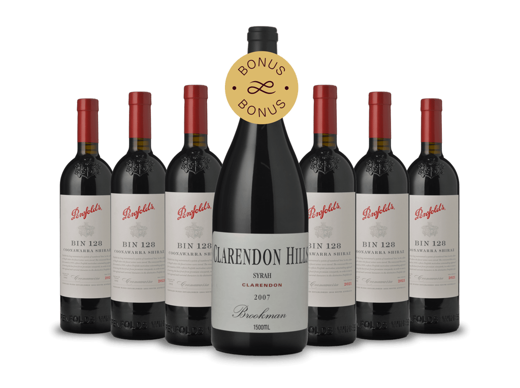 Collect icons at an incredible price. Save $150 on six bottles of Penfolds Bin 128 Shiraz 2021 and get a bonus Clarendon Hills Brookman Syrah Magnum 2007.
